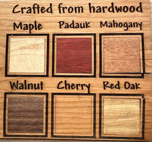 We make our items out of several different types of wood products and acrylic. Hard maple, walnut, padauk, red oak, mahogany and cherry are the hard woods we use. We also use different grades of plywood and basswood depending on the look of what we are trying to create.